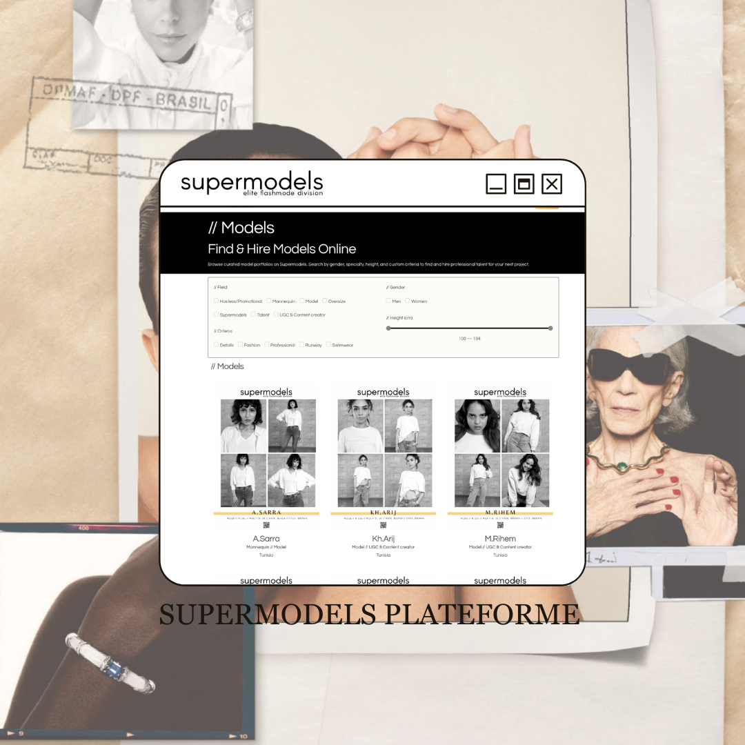 Votre portfolio professionnel, accessible en ligne, visible par les marques et les directeurs de casting. Flashmode est la seule agence en Tunisie à proposer cette plateforme exclusive à ses talents. Un profil Supermodels, c’est une présence permanente sur le marché — même quand vous dormez.