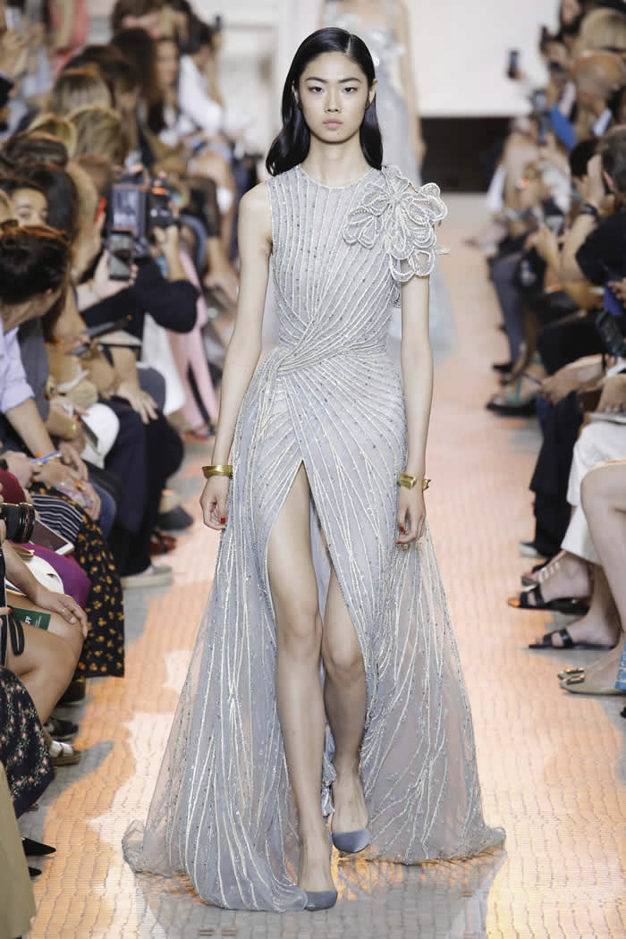Et ses femmes viennent à lui – dans ses ateliers de Beyrouth, de Londres et de Paris, parce qu’elles apprécient la confiance qui accompagne les broderies exquises, bien placées et savamment écaillées, une palette toujours flatteuse de tons neutres et de pierres précieuses, et la maîtrise technique pour permettre des fentes très hautes sans risque de fragments compromis.