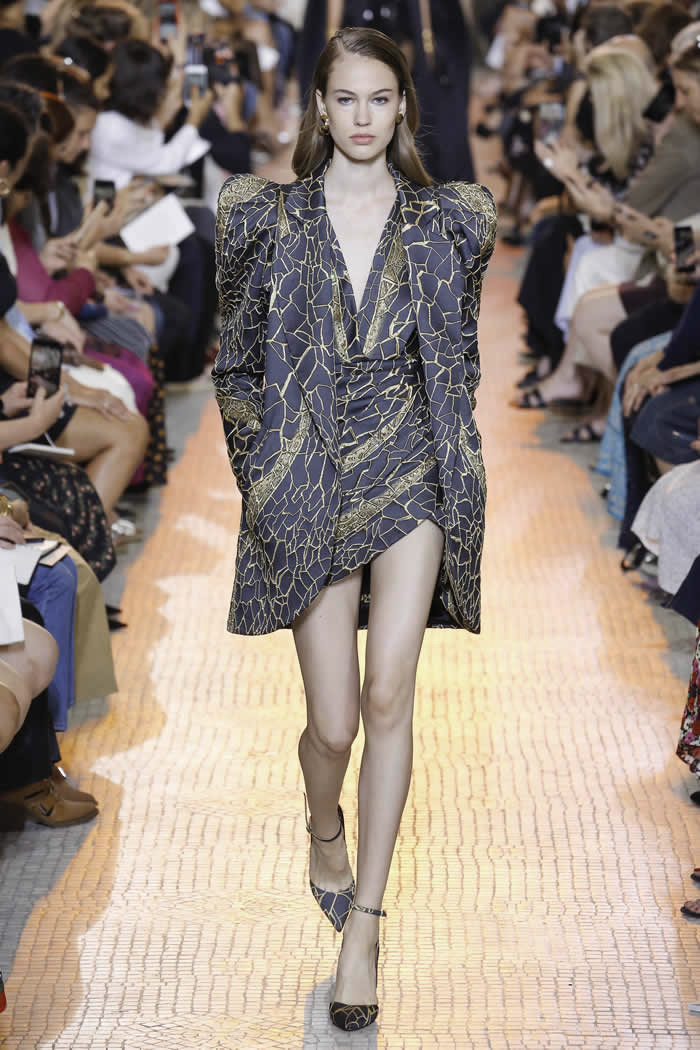 Cette saison, Saab s’est inspiré des chefs-d’œuvre luminescents, irréguliers et rigoureusement ambitieux de Gaudí. Cela a ajouté une verticalité chic aux broderies, que ce soit sur une robe à col roulé ou sur une veste de smoking ornée, vaguement matador-esque.