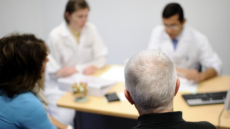 An urologist doctor speaks with a patient during a medical consultation at the CHU Angers teaching hospital, western France, on October 25, 2013. The Angers hospital employs 6,000 people including 980 doctors. AFP PHOTO / JEAN-SEBASTIEN EVRARD (Photo by JEAN-SEBASTIEN EVRARD / AFP) / RESTRICTED TO EDITORIAL USE – TO ILLUSTRATE THE EVENT AS SPECIFIED IN THE CAPTION