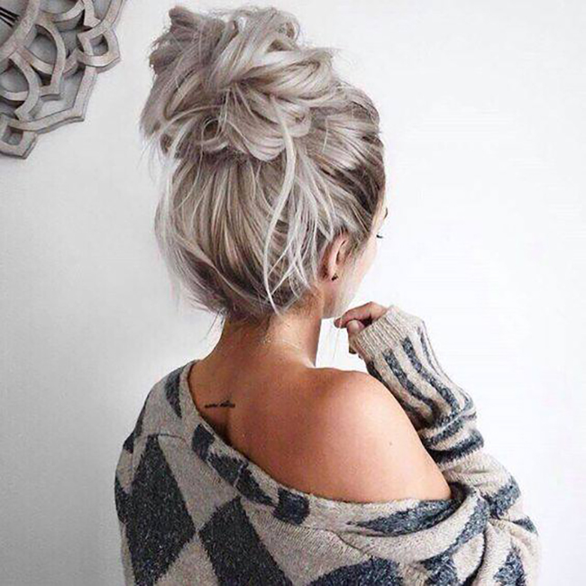 Le principe est d’une simplicité enfantine. Il suffit de relever ses cheveux sur le sommet du crâne comme pour faire un chignon classique. Le résultat finale détermine la tendance suivie. Dans le cas ci-dessus, il suffit de les attacher en laissant soigneusement dépasser quelques mèches, mettant ainsi votre nuque en valeur.