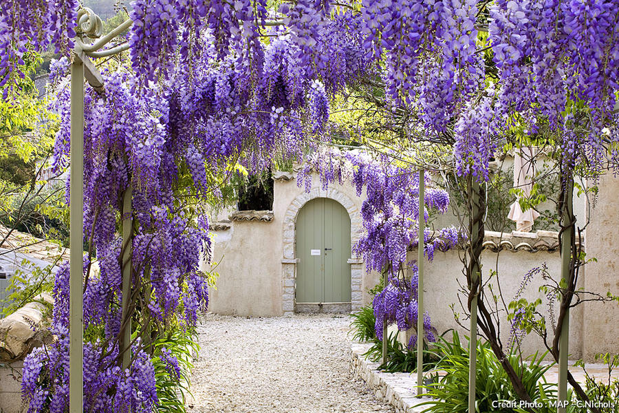 the rou estate, corfu, greece: wisteria on the main avenue. climber, blue flower