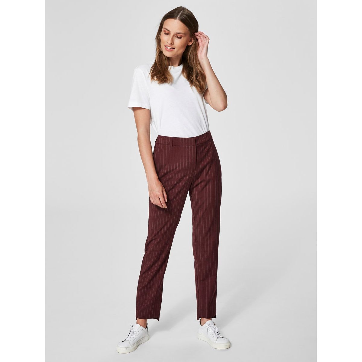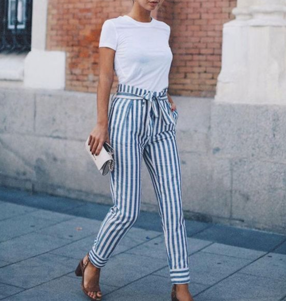 T-shirt blanc avec un pantalon classique à rayure