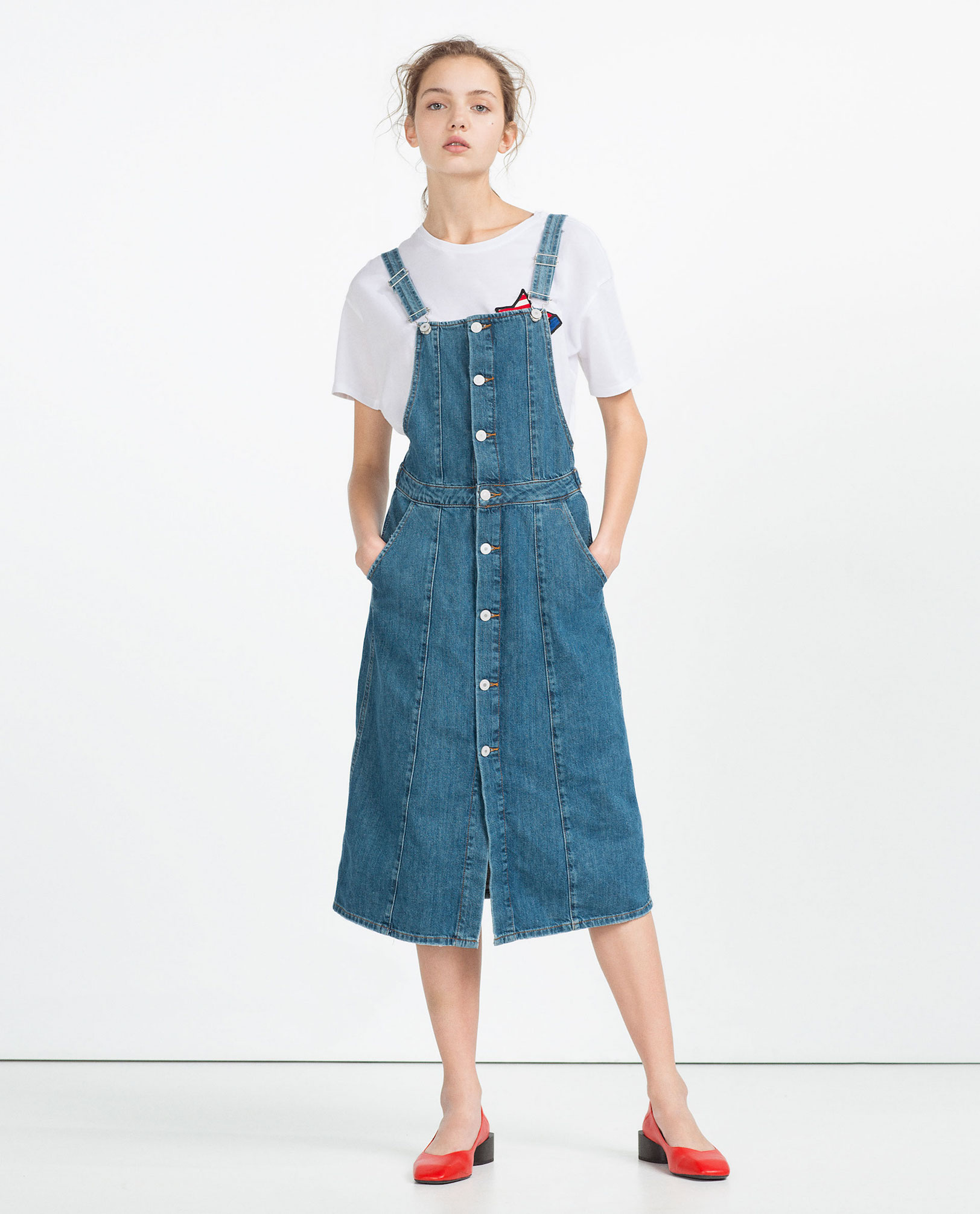 T-shirt blanc avec une robe salopette jean